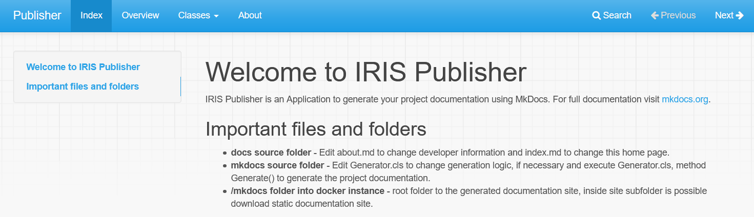 Con https://openexchange.intersystems.com/package/IRIS-Publisher puedes documentar tu IRIS Application y generar el Portal Web con Documentación de la Aplicación (responsive). Mira los resultados: