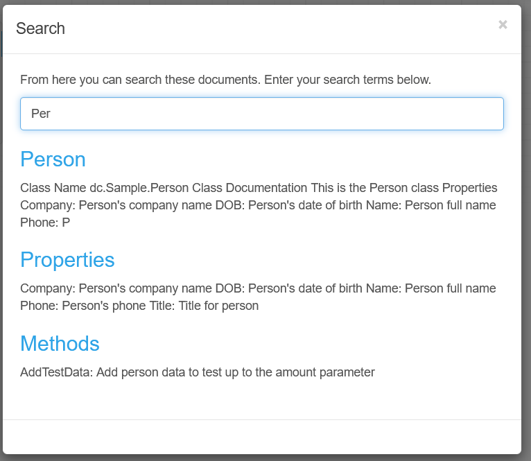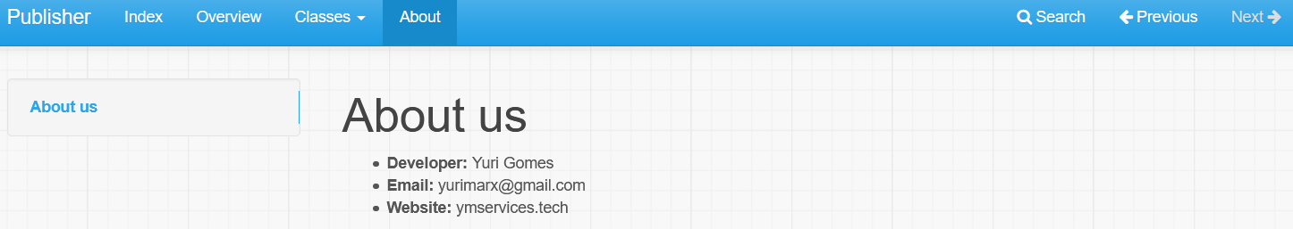 Menú "Clases" y página "Clase": La página "clase" con documentación de la clase, la lista de métodos y propiedades.