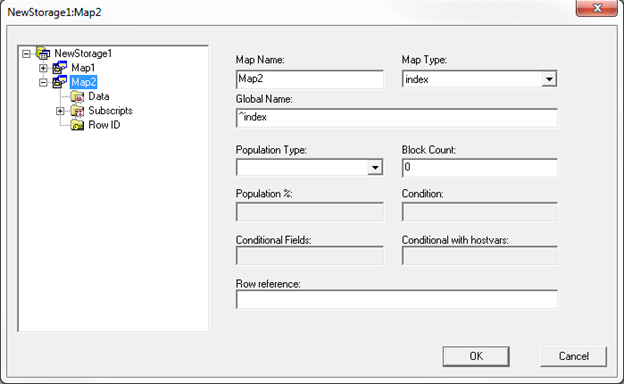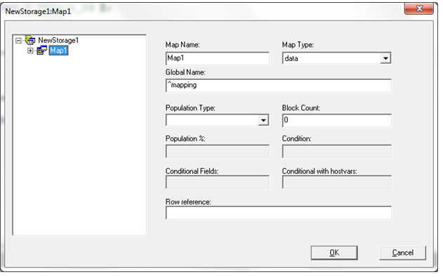 Lo primero que debemos hacer es crear la definición de almacenamiento. Haga clic en el icono "Storage" o utilice el Inspector, Storage, y luego haga clic con el botón derecho del ratón en "New Storage". Esta vez dejé el valor predeterminado para el campo "Map Name", y solamente llene la casilla" Global Name" con ^mapping.