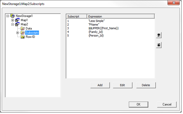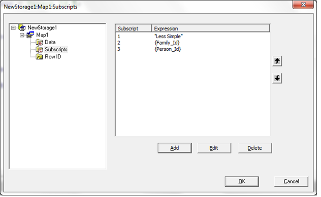 Comencemos de nuevo con la sección "Subscripts (Subíndices)". Primero necesitaremos 3 niveles de subíndice para definir todo, incluso la IdKey: 1 constante y 2 campos. Los campos que aparecen en esta ventana deben coincidir con las propiedades definidas para el índice IdKey.