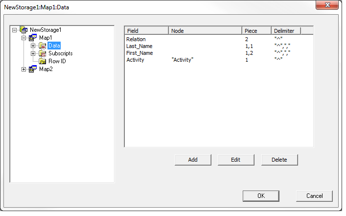 Para la sección "Data" tenemos 3 campos almacenados en 1 nodo global, y luego tenemos 1 campo almacenado en un nivel de subíndice inferior ("Activity"). Para obtener el nombre y el apellido como dos campos diferentes necesitaremos usar múltiples piezas y los delimitadores correspondientes para un $PIECE() anidado. En ObjectScript esto se vería como: set FirstName=$PIECE($PIECE(^mapping("Less Simple",1,1),"^",1),",",",2). También necesitamos hacer una lista en el asistente, con todos los delimitadores y las piezas comenzando desde la parte más interna de $PIECE() y trabajando hacia afuera. El subíndice inferior Activity está en un nodo global diferente, por lo que añadimos la constante a Node. Piece y Delimiter están por defecto en 1 al igual "^", así que los dejé allí.