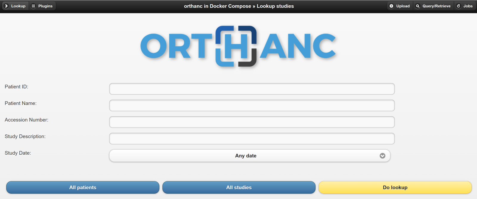 version:'3.1'# Secrets are only available since this version of Docker Composeservices: orthanc: image:jodogne/orthanc-plugins:1.11.0 command:/run/secrets/# Path to the configuration files (stored as secrets) ports: -4242:4242 -8042:8042 secrets: -orthanc.json environment: -ORTHANC_NAME=orthanc volumes: -/tmp/orthanc-db/:/var/lib/orthanc/db/ hostname:orthanc iris: container_name:iris build: context:. dockerfile:iris/Dockerfile ports: -"52773:52773" -"2010:2010" -"23:2323" -"1972:1972" volumes: -./shared:/shared command: --check-capsfalse hostname:irissecrets:orthanc.json: file:orthanc.jsonEl acceso al visor web de Orthanc se realizará por el puerto 8042 (http://localhost:8042), la IP destinada a recibir imágenes vía TCP/IP será el 4242 y su configuración se realizará desde el archivo orthanc.json. El portal de gestión de nuestro IRIS for Health será el 52773.