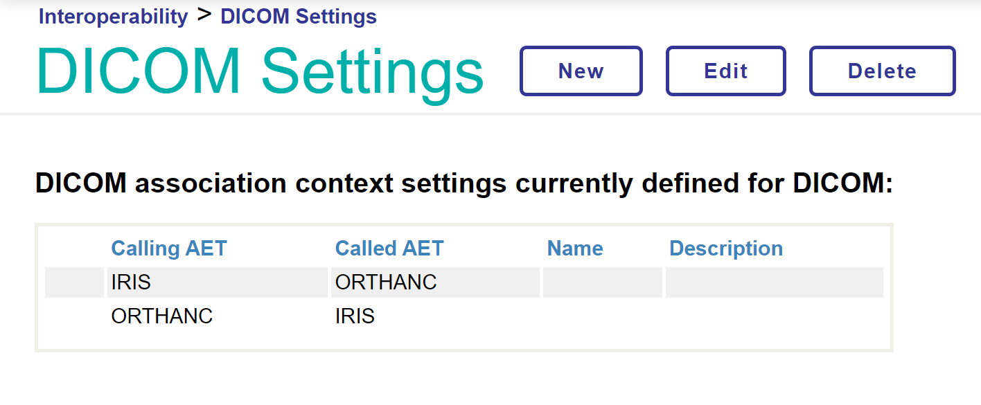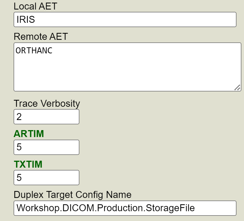 Hemos configurado dos elementos clave para el envío a PACS, el AET de nuestro IRIS for Health (IRIS) y el AET de nuestro PACS (ORTHANC). Sin esta configuración no es posible ningún envío de imágenes, ya que tanto IRIS como Orthanc validarán que la modalidad que envía/recibe tiene permiso para hacerlo.