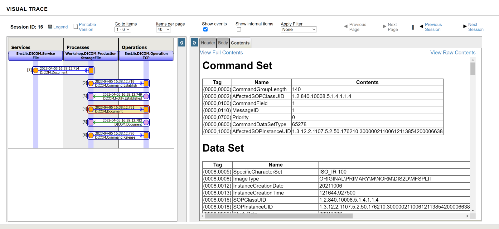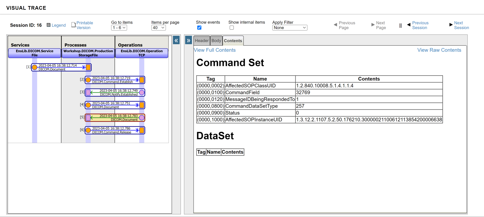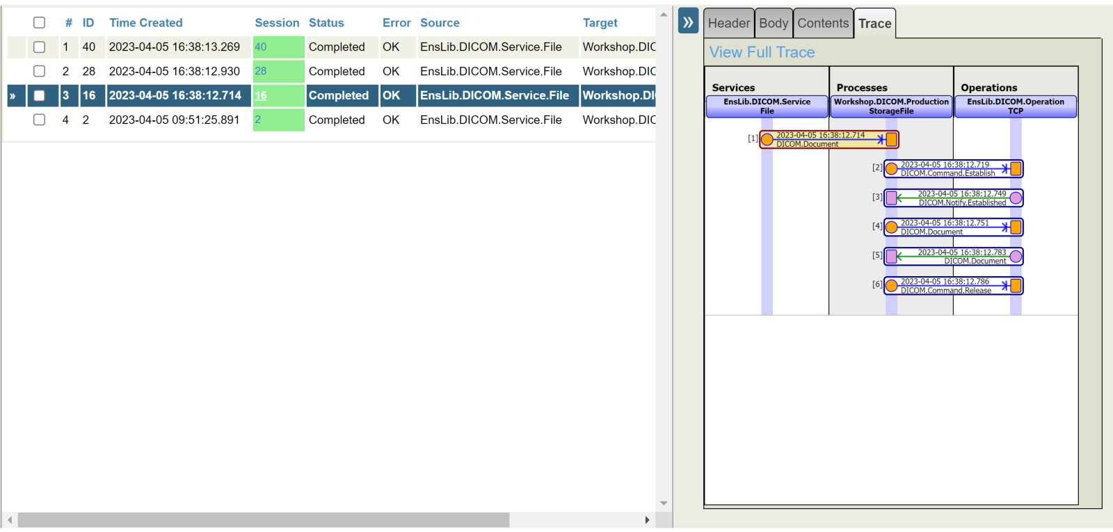 ¡Muy bien! Aquí tenemos registrados nuestros ficheros DICOM y podemos ver como han pasado por nuestra producción hasta ser enviados a Orthanc. Entremos en más detalles revisando un mensaje.