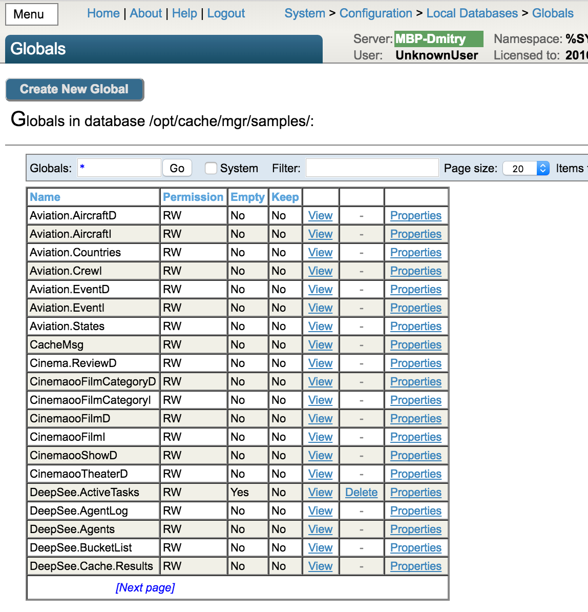 Por lo tanto, el primer bloque en una base de datos típica de Caché contiene la información de servicio acerca del mismo archivo en la base de datos, mientras que los segundos bloques constituyen un diagrama de bloques. El primer bloque del catálogo va en el tercer lugar (bloque #3), y una sola base de datos puede tener varios bloques en el catálogo. Los siguientes son bloques punteros (ramas), bloques de datos (hojas) y bloques de cadenas largas. Como ya mencioné anteriormente, los bloques en los catálogos globales almacenan información sobre todos los globales que existen en la base de datos o en la configuración global (si no hay datos disponibles en este tipo de globales). En este caso, un nodo que describa a dicho global tendrá un puntero nulo de nivel inferior. Puede consultar la lista de los globales que están disponibles en el catálogo de globales que se encuentra en el portal de administración. En este portal también se le permitirá guardar un global en el catálogo después de haberlo eliminado (por ejemplo, guardar su secuencia de compilación) así como crear un nuevo global con un tipo de compilación ya sea predeterminada o personalizada.