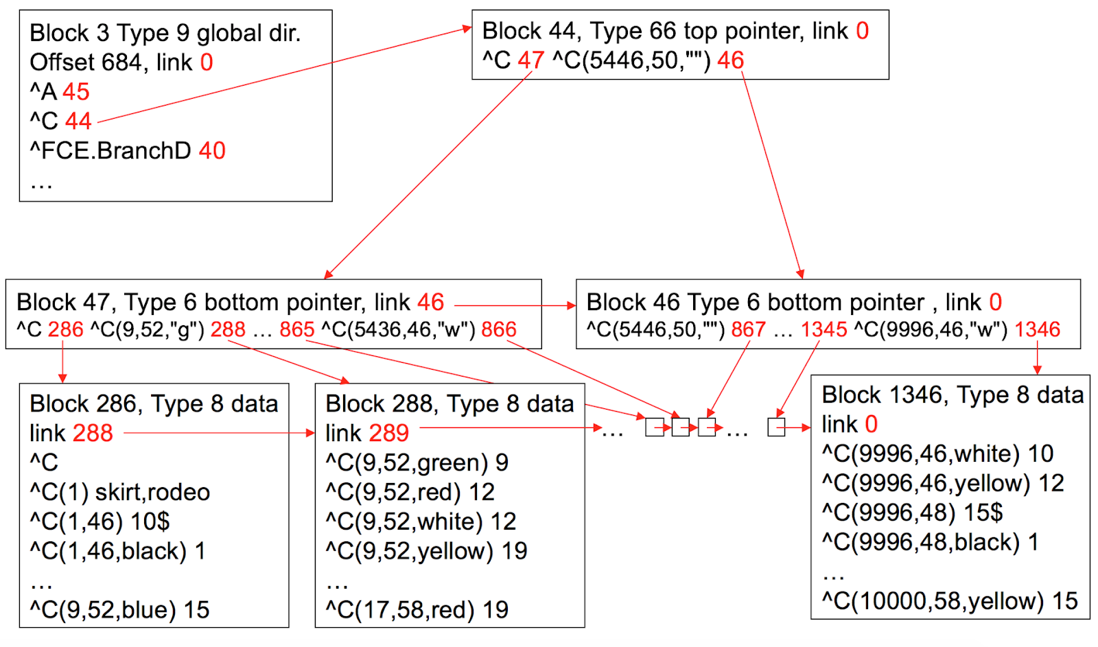 - Tipo 70: Bloques punteros tanto de alto nivel como de nivel inferior. Estos bloques se utilizan cuando el global correspondiente almacena una pequeña cantidad de valores y, por lo tanto, no es necesario tener varios niveles de bloques. Estos bloques generalmente señalan hacia los bloques de datos, al igual que los bloques de un catálogo de globales.