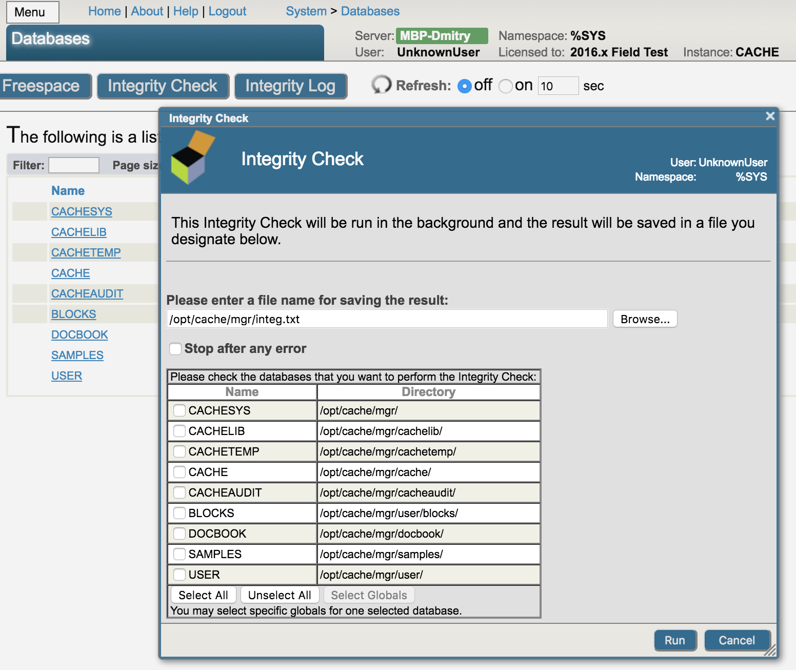 La opción "integrity check" incluye la verificación de los enlaces en los niveles inferiores, la validación de los tipos de bloques, el análisis de los enlaces correctos y la correspondencia de los nodos globales con la secuencia para la aplicación de la compilación. Si el programa encuentra algún error durante la comprobación de la integridad, puede ejecutar nuestra herramienta ^REPAIR desde el namespace %SYS. Al utilizar esta herramienta, podrá visualizar cualquier bloque y modificarlo según sea necesario, por ejemplo, para reparar su base de datos.