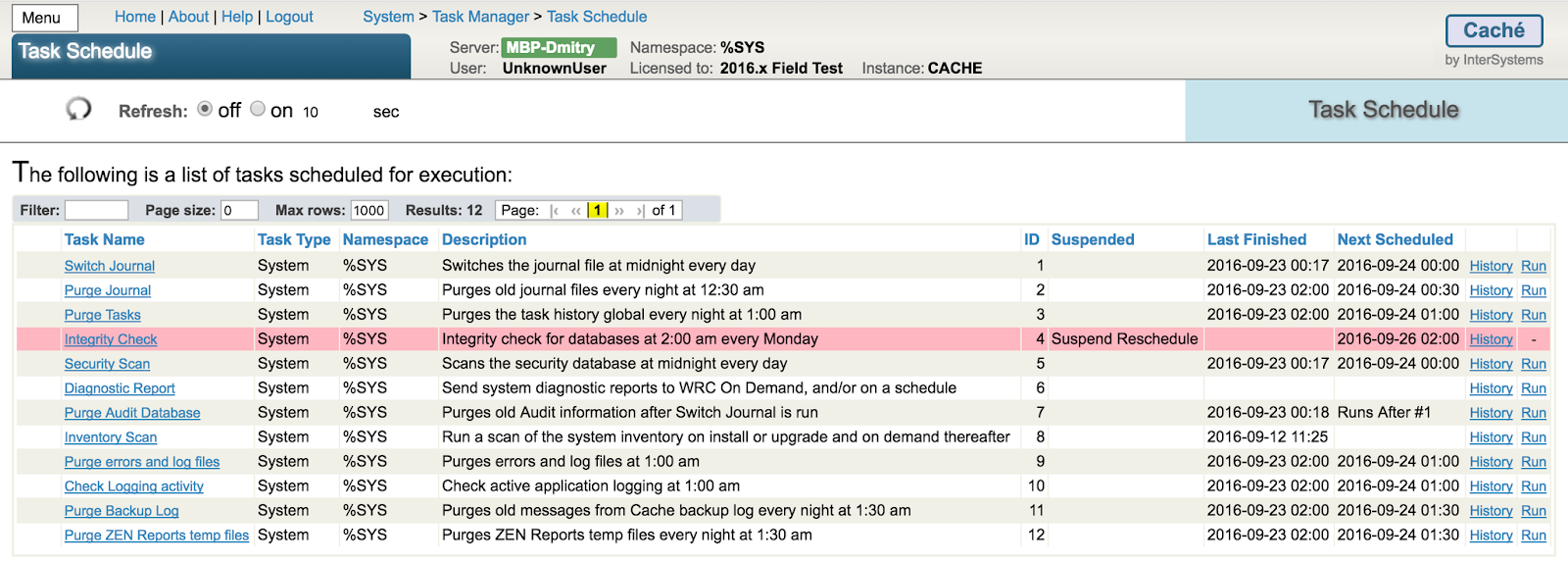 En la versión actual de Caché, resolvimos los temas y los problemas más importantes con las bases de datos, entonces el riesgo de degradación en las bases de datos es extremadamente bajo. Sin embargo, le recomendamos que realice comprobaciones de la integridad automáticas en las bases de datos de manera regular utilizando nuestra herramienta ^Integrity, la cual puede ejecutarse en el terminal desde el namespace %SYS, mediante nuestro portal de administración, en la página de la Base de datos o desde el administrador de tareas. Por defecto, la comprobación de la integridad automática ya está configurada y predefinida, por lo tanto lo único que debe hacer es activarla: