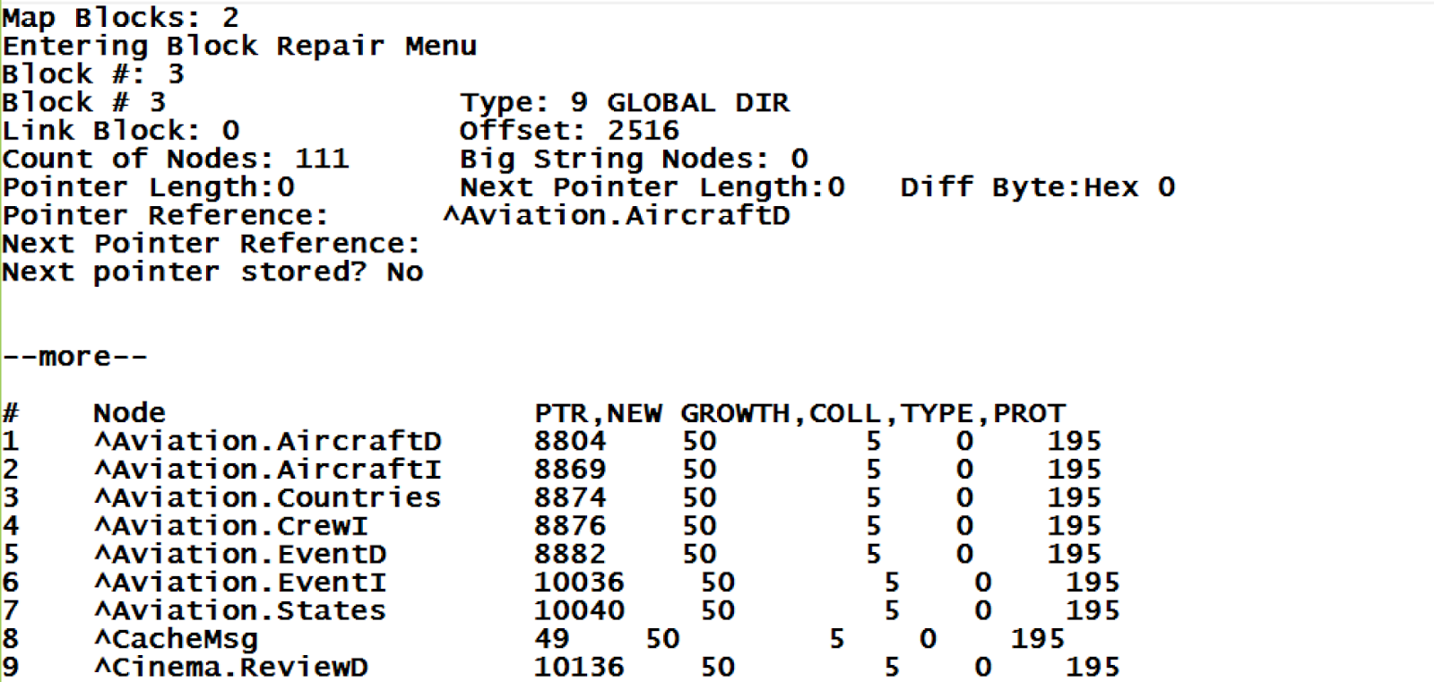 - Tipo 9: Bloques de un catálogo de globales. En estos bloques generalmente se describen todos los globales existentes junto con sus parámetros, incluida la compilación de los subíndices globales, el cual es uno de los parámetros más importantes y no puede modificarse una vez que el global se creó