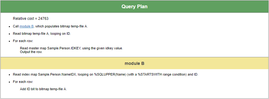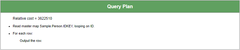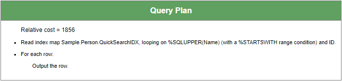 El plan de consulta ahora usa NameIDX, y vemos que debemos leer desde el global de datos (“mapa maestro”) de Sample.Person usando los IDs de filas relevantes, encontrados mediante el índice.