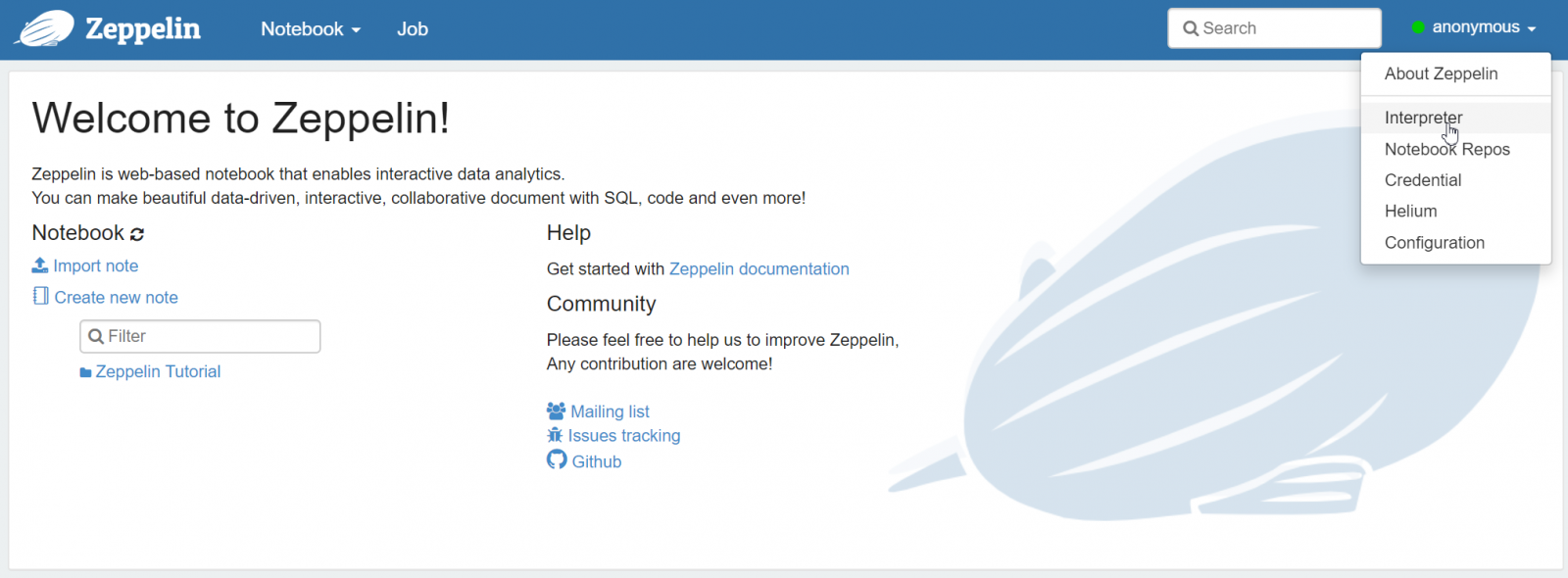 Tras descomprimirlo, podemos ejecutar Zeppelin con el script con \bin\zeppelin.cmd, que se encuentra en la raíz de su carpeta Zeppelin. Tras aparecer "Done, zeppelin server started" ya podemos abrir la interfaz http://localhost:8080 en el navegador. Si todo se ejecutó de manera correcta, aparecerá lo siguiente: