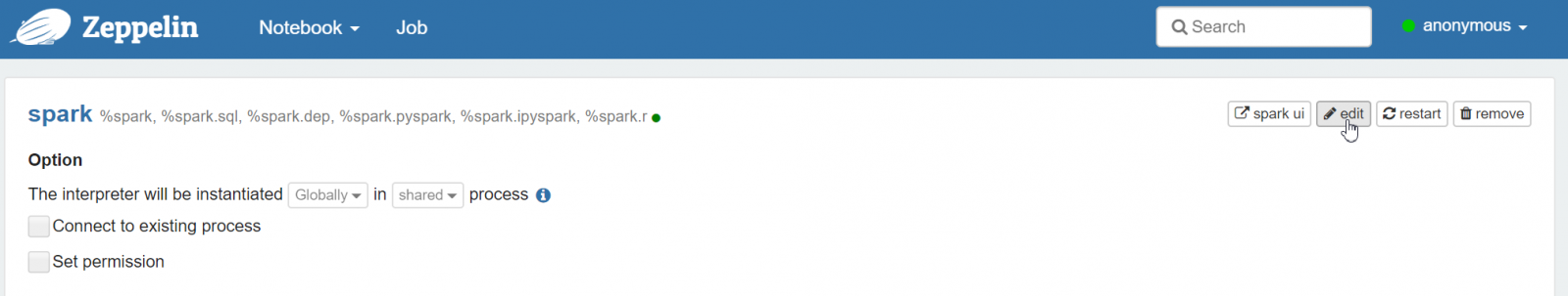 En la interfaz de Zeppelin, hacemos click en la esquina superior derecha de la pantalla en  anonymous > Interpreter. Nos desplazamos hacia abajo y buscamos spark.