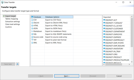 1. Expande la conexión de muestra (DB2 connection) > public y selecciona todas las tablas. Haz clic derecho con el ratón sobre las tablas seleccionadas y elige Export Data, así: