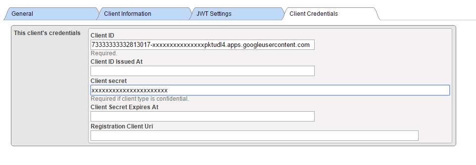 Deje vacías las pestañas Client Information y JWT Settings (con los valores predeterminados) y complete los campos de la pestaña Client credentials.