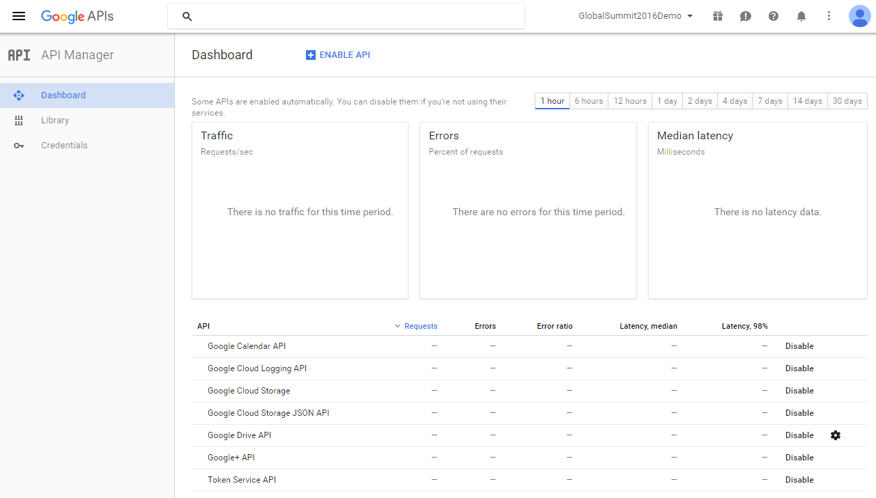 Para esta demo, creamos la cuenta GlobalSummit2016Demo. Asegúrese de que tenemos habilitada la API del Drive API.