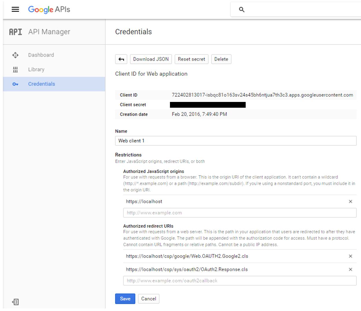 Proporcione los valores de Client ID y los de Client Secret que se obtuvieron del formulario para definir Google Credentials (si utiliza la configuración manual).