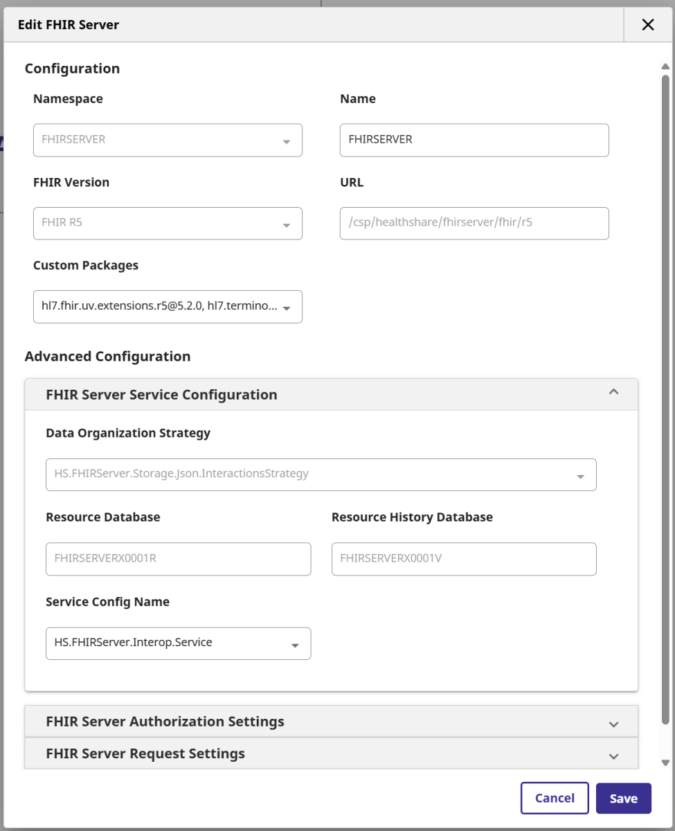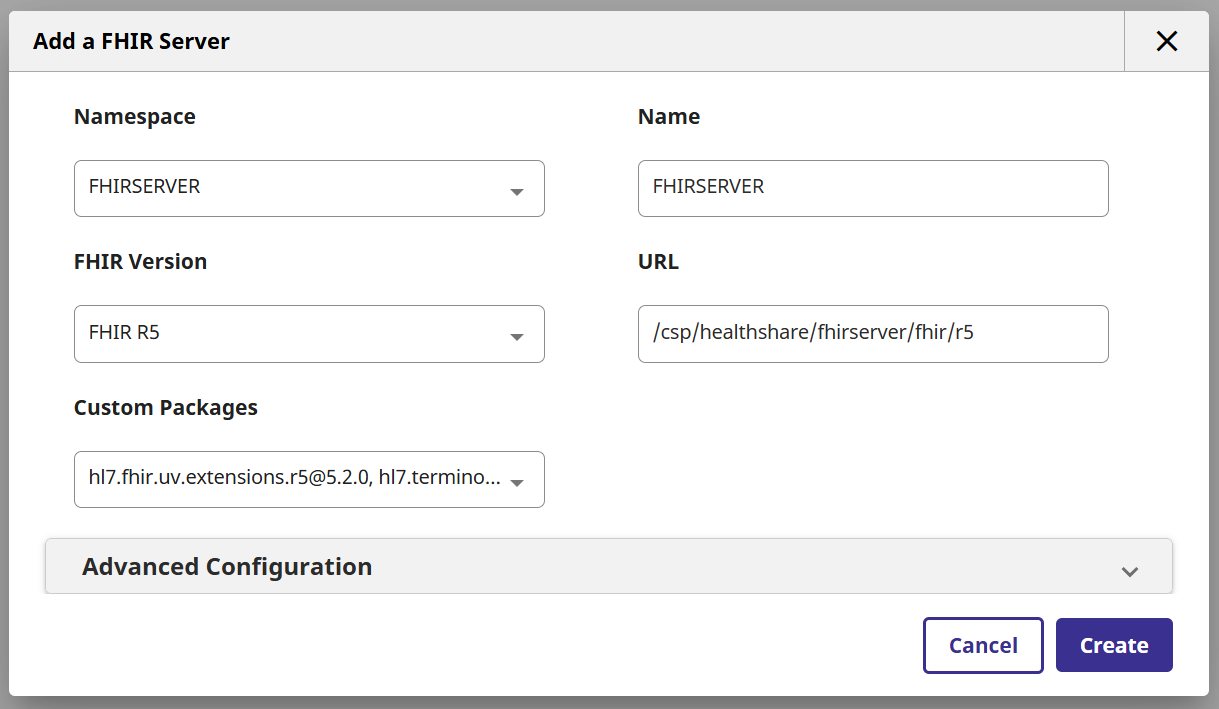 Health Connect permite (consultar condiciones de la licencia) desplegar un repositorio FHIR R5 de una forma sencilla desde un namespace con la opción de interoperabilidad habilitada desde el menú Health -> FHIR Server Management
