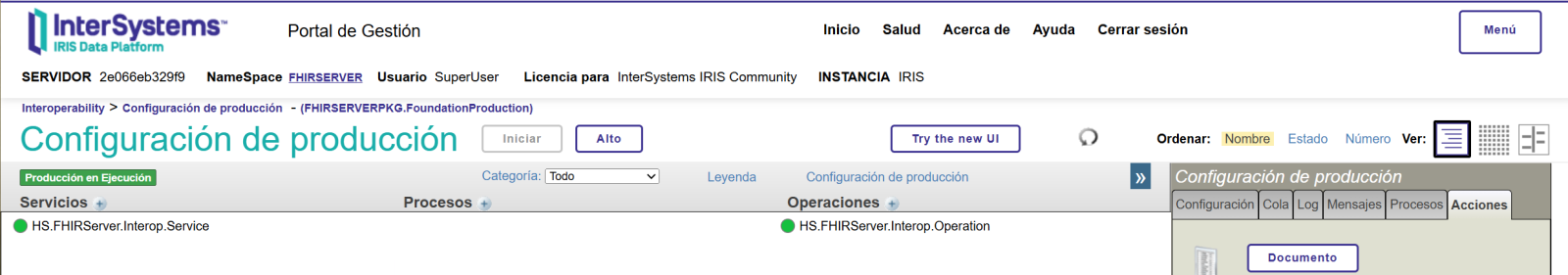 Una de las características más interesantes del repositorio FHIR en Health Connect es la posibilidad de utilizar el motor de interoperabilidad para capturar y transformar toda interacción con el repositorio FHIR para adaptarlo a nuestras necesidades. Para ello sólo necesitamos, desde la producción ligada al namespace donde tenemos desplegado el repositorio FHIR, incluir el business service HS.FHIRServer.Interop.Service y el business operation HS.FHIRServer.Interop.Operation. Esta será la pinta de la producción para el namespace que contiene nuestro repositorio: