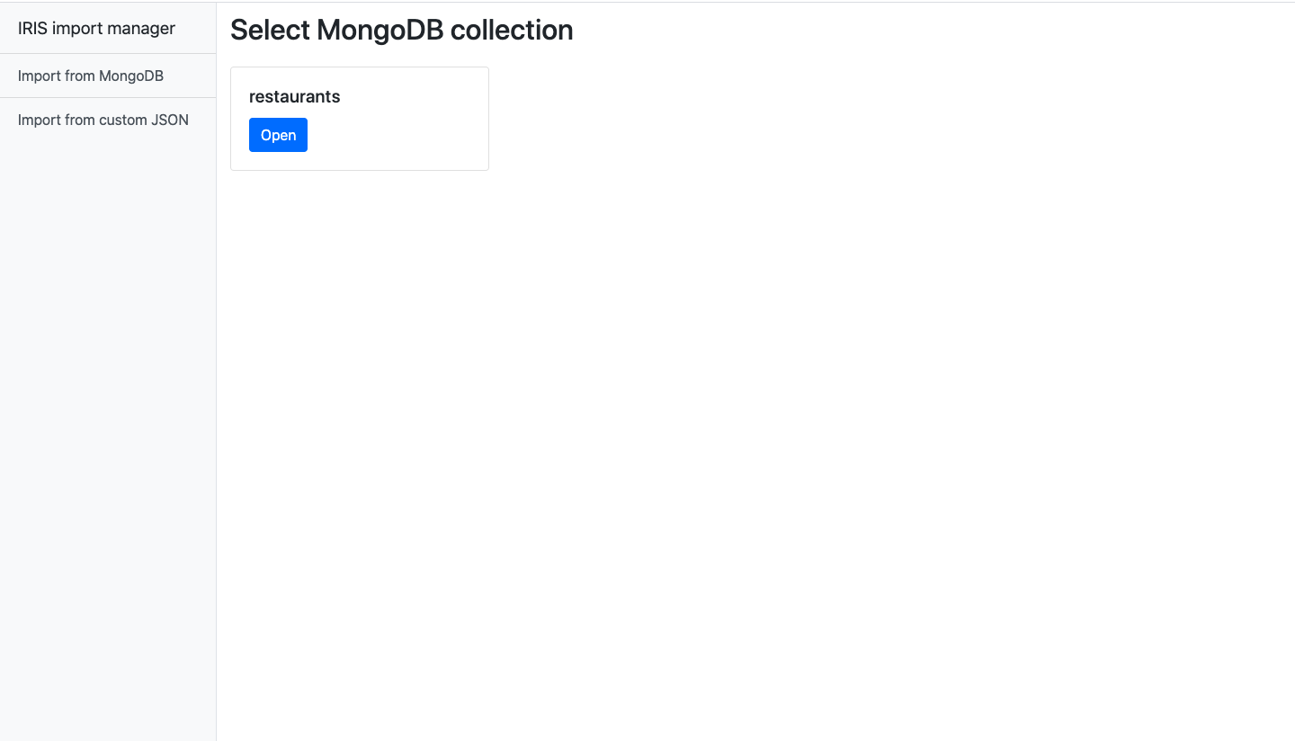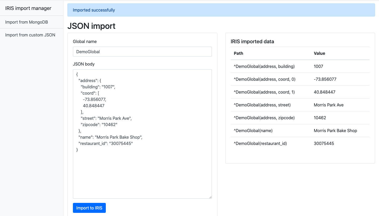 Esta aplicación permite importar datos en formato JSON y también ofrece una interfaz muy sencilla para transferir datos desde colecciones en MongoDB a globals en IRIS. Nunca ha sido más fácil.