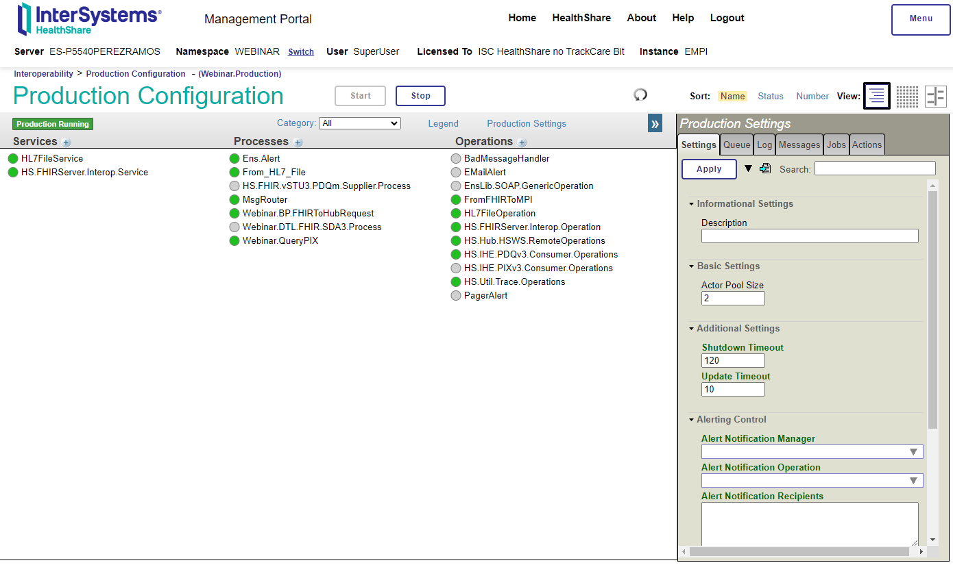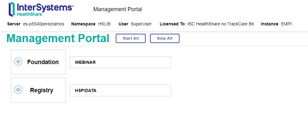 Cómo podéis observar, tras la instalación del EMPI en modo standalone se creó un servicio de Registry con todas las opciones necesariarias para configurar nuestro EMPI, así como un namespace que llamamos HSPIDATA y en el que disponemos de una producción para gestionar las funcionalidades de interoperabilidad que necesitamos.