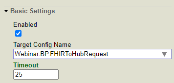 El mensaje es del tipo HS.FHIRServer.Interop.Request y si consultamos la documentación veremos que lleva asociado una propiedad denominada QuickStreamId la cual utilizaremos para extraer el mensaje FHIR asociado. Para ello redirigiremos el mensaje recibido en el Business Service al Business Process Webinar.BP.FHIRToHubRequest