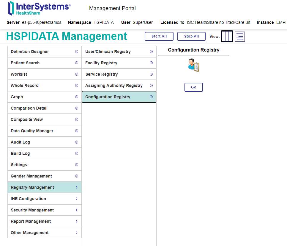 En esta clase es donde realizaremos la configuración básica de nuestro EMPI, desde la definición de campos de los índices a la definición de los pesos que tendrá en el proceso de comparación cada uno de los campos de datos del paciente. Como observaréis, configurar dichas opciones desde el propio fichero resultaría poco amigable, pero no os preocupéis, HealthShare tiene habilitada una pantalla a tal efecto y a la que accederemos a través de HealtShare -->HSPIDATA (o como lo hayáis declarado en vuestra instancia) -->Definition Designer :