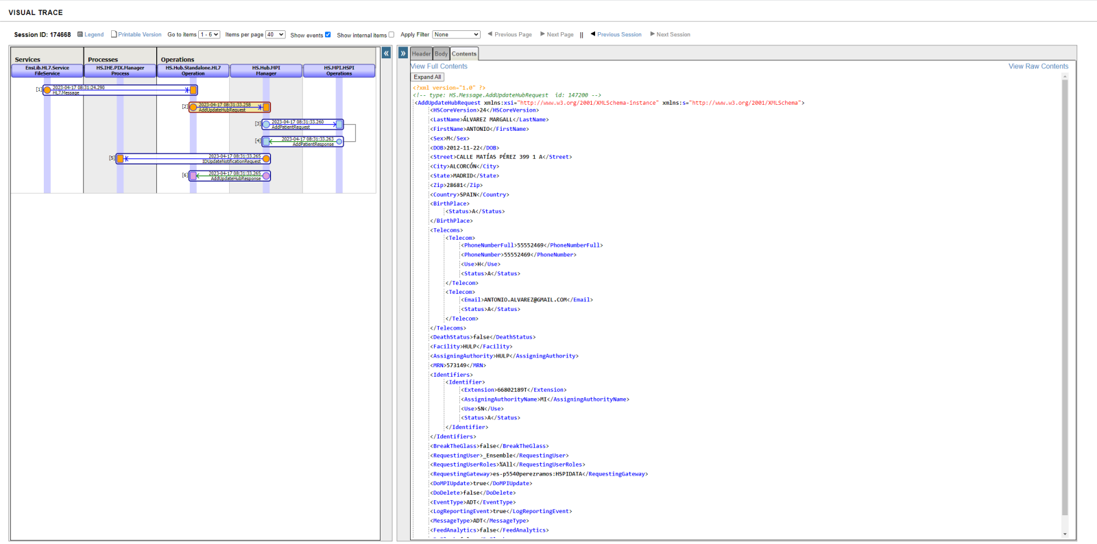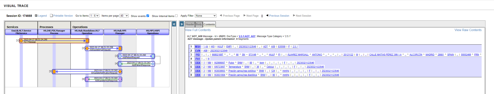 Aquí tenemos la traza de uno de los mensajes registrados. Como podéis ver ha entrado por nuestros Business Service alimentado por ficheros de HL7, a continuación ha pasado al Business Operation HS.Hub.Standalone.HL7.Operation donde los datos del mensaje se han transformado del formato HL7 al formato SDA utilizado por el EMPI: