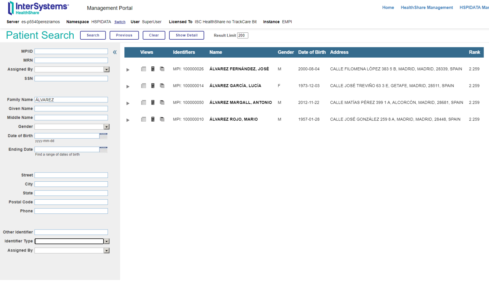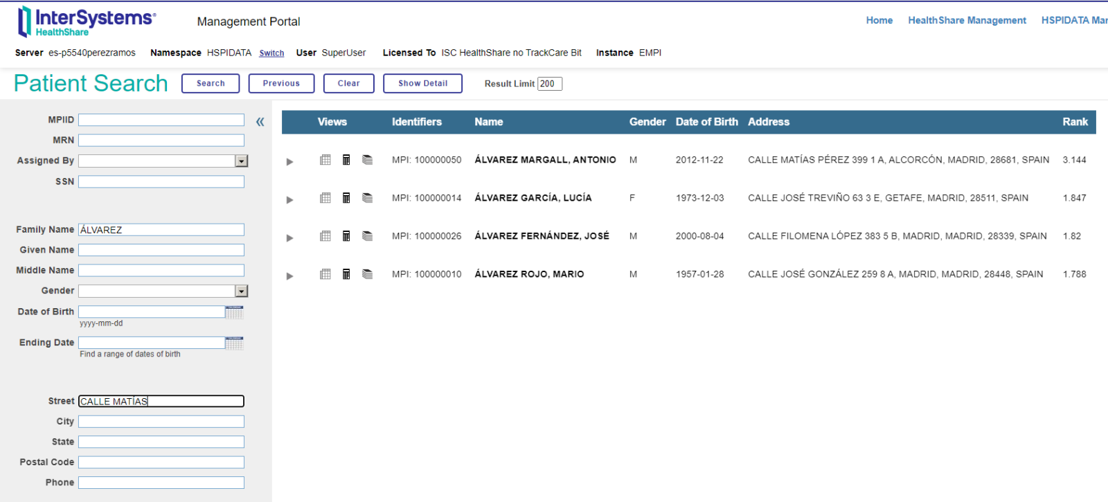 Aquí tenemos el resultado. 4 pacientes registrados en el sistema con apellido Álvarez. Si os preguntáis que significa el valor de columna Rank es símplemente la probabilidad de que sea ese paciente el que estás buscando. Como únicamente hemos definido un apellido todos los que tienen dicho apellido tienen la misma probabilidad (es una búsqueda probabilística). Si introducimos más campos en nuestra búsqueda veremos como dicha probabilidad va cambiando, aumentando para aquellos que más se aproximen a la búsqueda realizada.