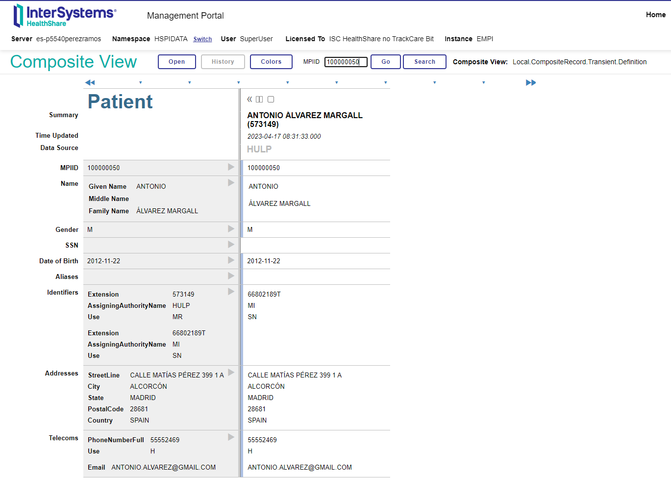 En esta vista compuesta podéis ver los datos administrativos que se han definido en la clase Local.CompositeRecord.Transient.Definition (sí, la misma clase definida en la configuración en el parámetro \HSPI\CompositeRecordDefinition). Esta clase es totalmente personalizable por los usuarios y al pertenecer al paquete de Local no se pisará en futuras actualizaciones del EMPI.