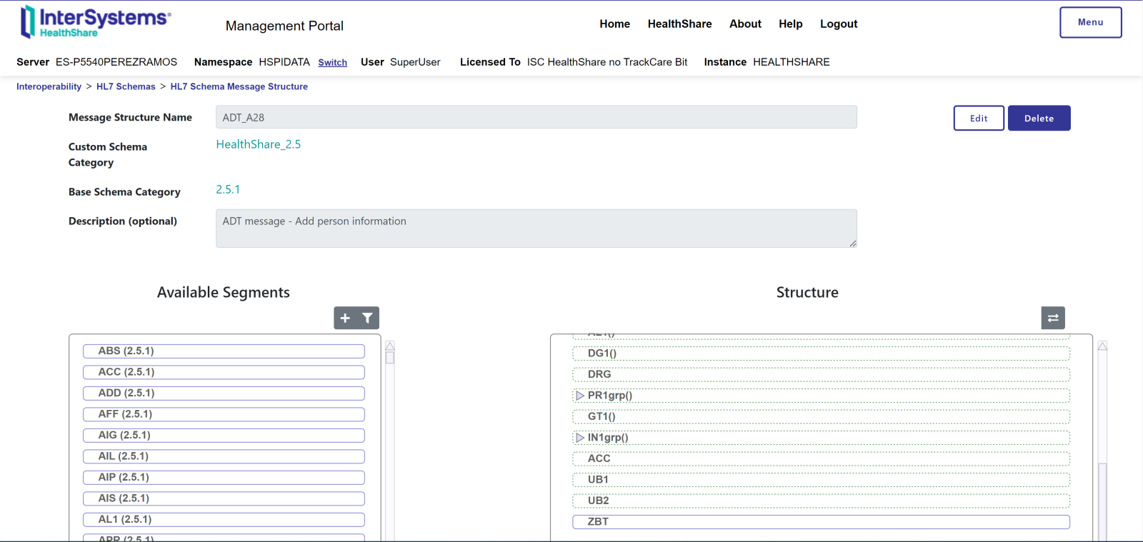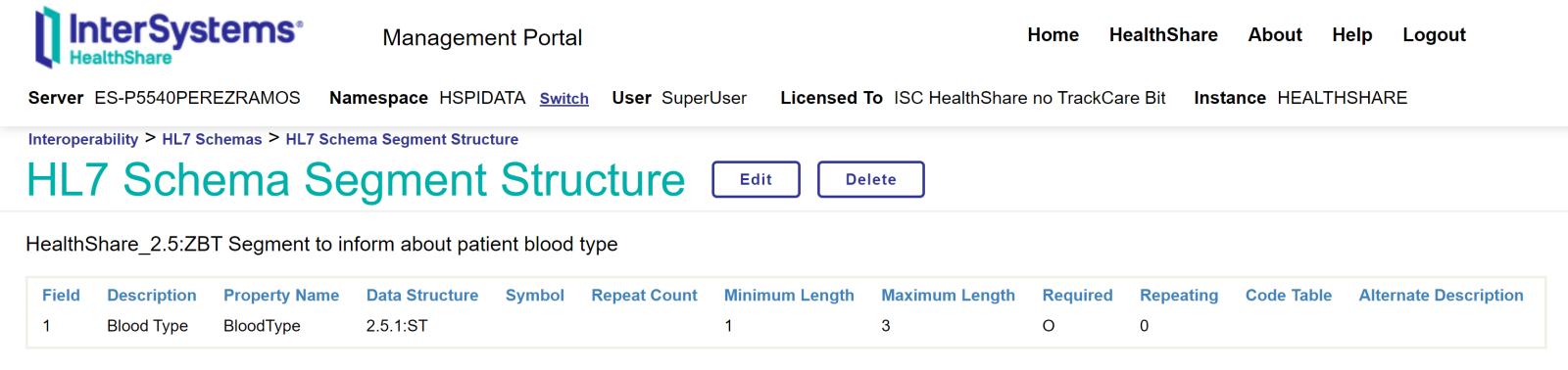 Aquí tenemos nuestro nuevo esquema HealthShare_2.5 que como véis, extiende del estándar 2.5.1 y hemos creado una nueva estructura de mensaje del tipo A28. Para añadir un nuevo segmento crearemos primeramente dicho segmento al que llamaremos ZBTy le añadiremos el campo que contendrá el tipo sanguíneo: