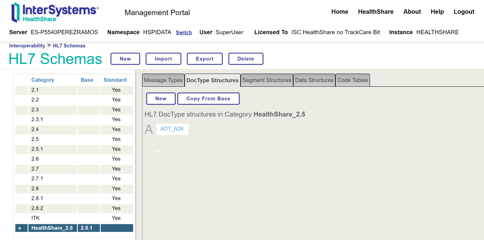 En nuestro ejemplo usaremos un mensaje A28 al que añadiremos un nuevo segmento con la información del tipo sanguineo. Para ello vamos a crear un nuevo esquema basado en el esquema estándar 2.5.1 y vamos a crear un nuevo DocType para el tipo de mensaje A28.