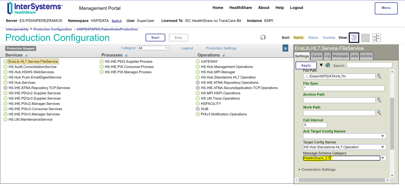Nuestro mensaje entra por EnsLib.HL7.Service.FileService y este se redirige a HS.Hub.Standalone.HL7.Operation, aquí tenemos la configuración de dicho Business Operation: