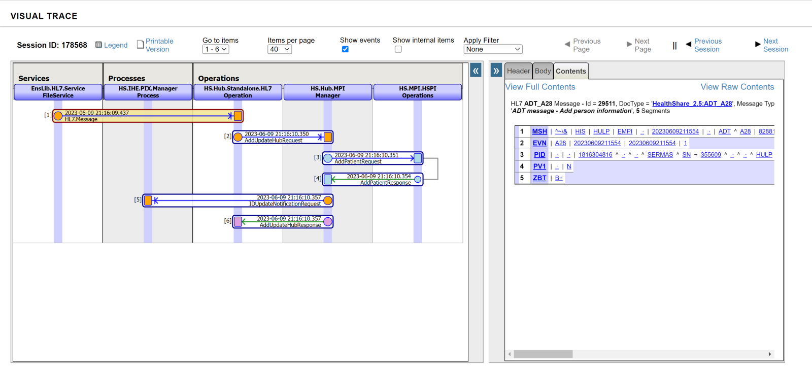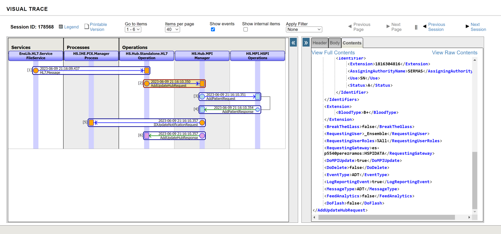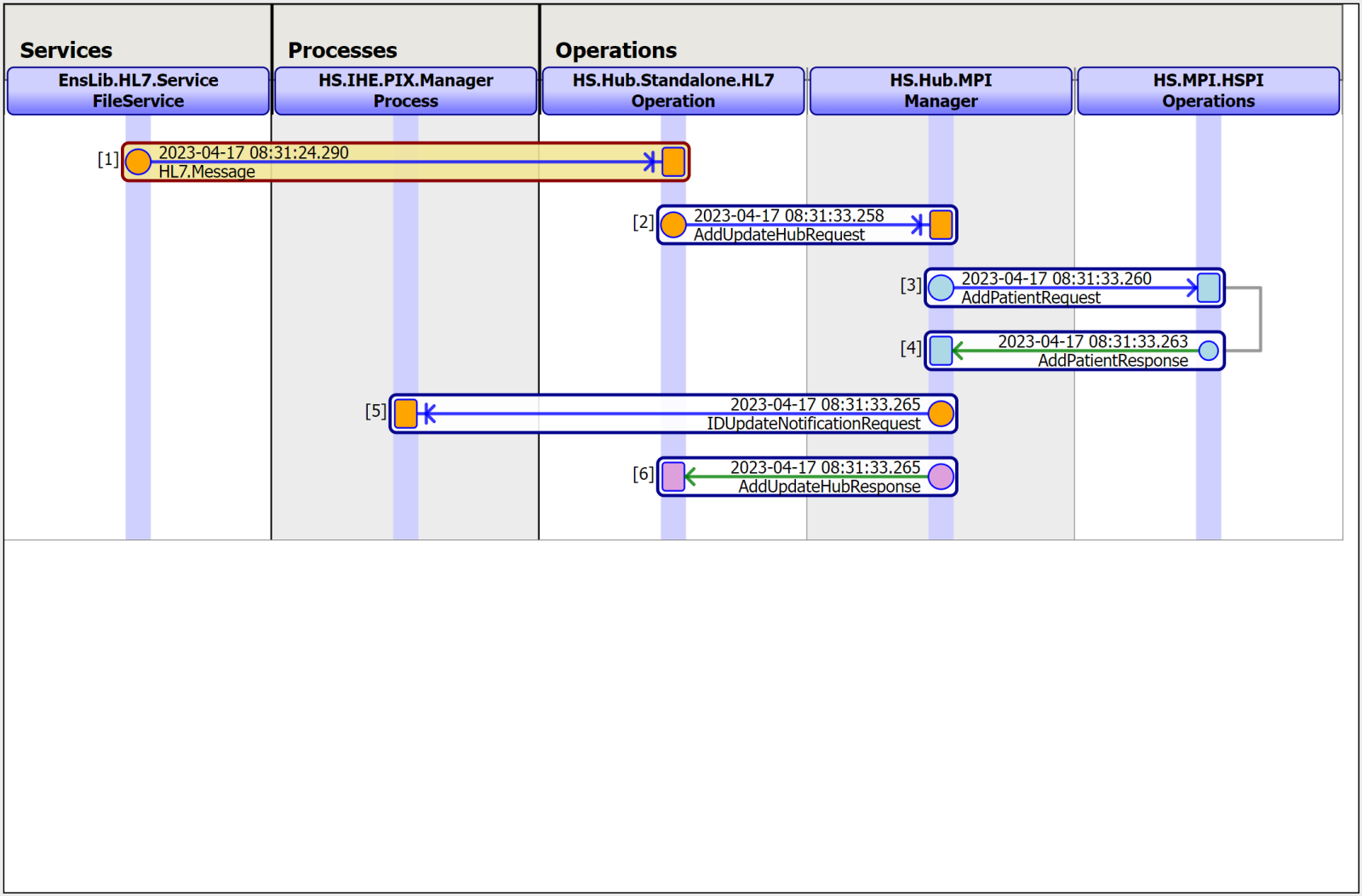 En nuestro ejemplo estamos usando el Business Service EnsLib.HL7.Service.FileService que capturará ficheros con mensajes HL7 de la ruta especificada, para adaptarlo al nuevo tipo de mensajes que vamos a recibir modificaremos el Message Schema Category para hacer referencia al nuevo esquema creado. Echemos un ojo a uno de los ejemplos de los mensajes que enviamos en el ejemplo del artículo anterior para identificar los Business Components por los que pasan nuestros mensaje y poder identificarlos: