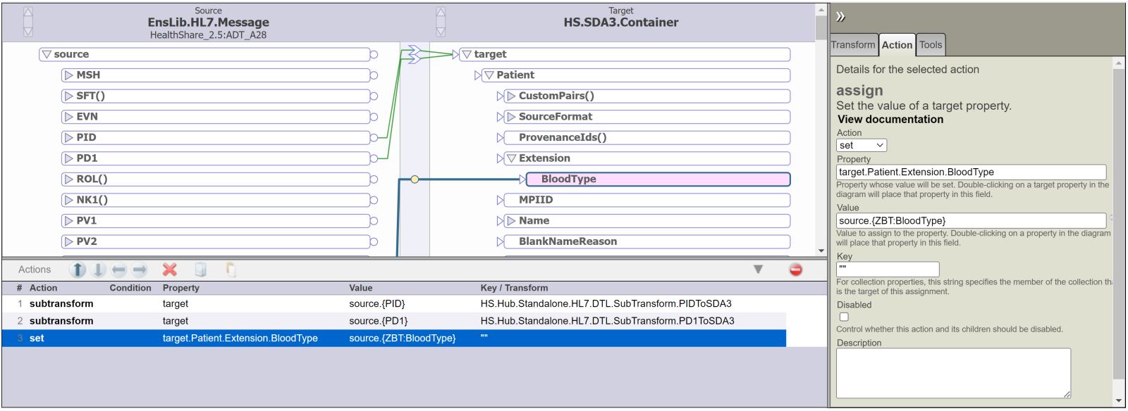 - Asignar el valor del campo BloodType del segmento ZBT de nuestro mensaje al campo BloodType que encontramos dentro de la propiedad Extension incluida en Patient. Este campo BloodType está disponible al haber añadido la propiedad BloodType en la clase HS.Local.SDA3.PatientExtension.