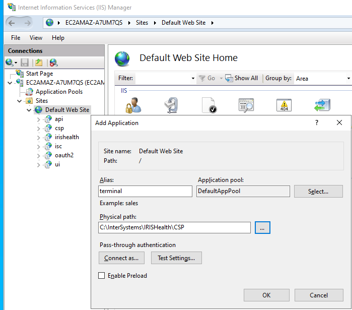 - Añadir las aplicaciones /terminal y /terminalsocket a IIS. Redigirlas para usar el module CSPms del Webgateway, sin verificar si el archivo existe.