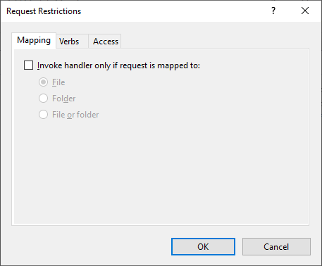 Además, en el "Request Restrictions", es importante permitir las llamadas sin validar que exista un fichero correspondiente. Esto se hace sacando el "check" al "Invoke handler only if request is mapped to:".