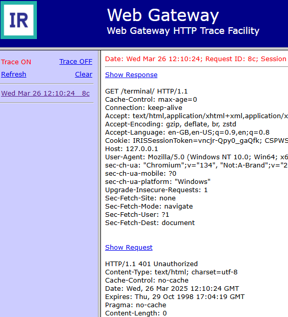 En el menu "View HTTP Trace" s puede ver la petición y la respuesta de IRIS (un Error 401).
