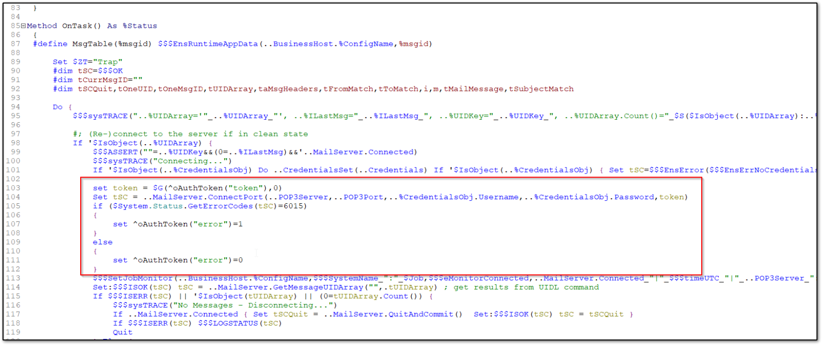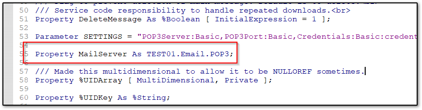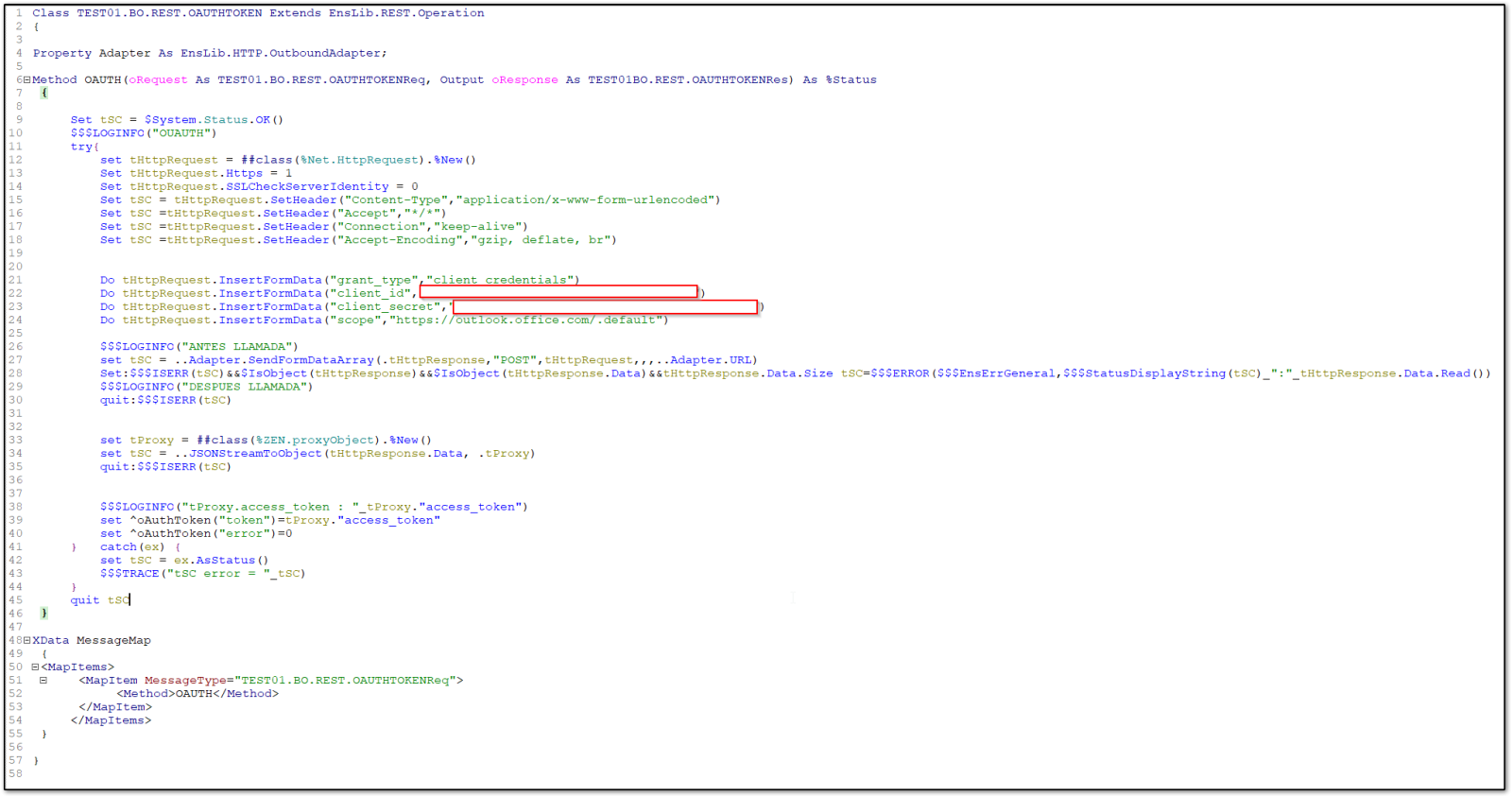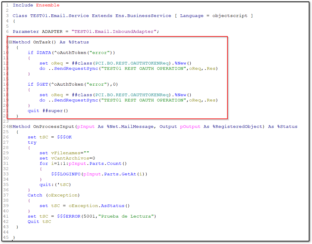 TEST01.Email.InboundAdapter : Esta clase es una copia de EnsLib.EMail.InboundAdapter, pero se deben hacer 2 modificaciones, lo primero es modificar la propiedad Mail Service por "Property MailServer As TEST01.Email.POP3;", y además se debe modificar el método on Task de tal forma de que utilicé la global que almacena el token necesario para a la casilla de correo, token resctado desde el servicio de REST de autenticación (clase TEST01.BO.REST.OAUTHTOKEN).