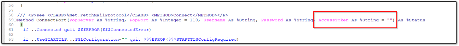 TEST01.Email.POP3 : Esta clase es una copia de la clase %Net.POP3 de iris 2020, pero se debe modificar el método ConnectPort y agregar un nuevo parámetro "AccesToken", además se deben agregar el código (que se puede rescatar desde la misma clase pero de la versión 2022) que utiliza el token para conectar con el servidor de correo.