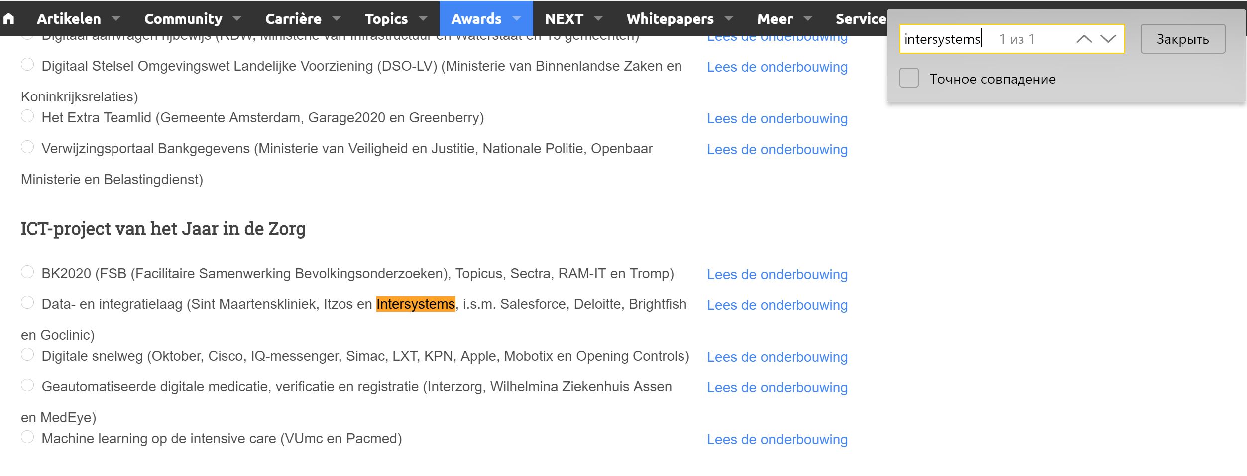 3. Busque "InterSystems" en la página (pulsando las teclas CTRL + F a la vez, o CMD + F si utiliza un Mac), o desplácese por la página hacia abajo, hasta que encuentre la categoría de premio “IT project of the Year in Healthcare.” Elija la segunda opción: