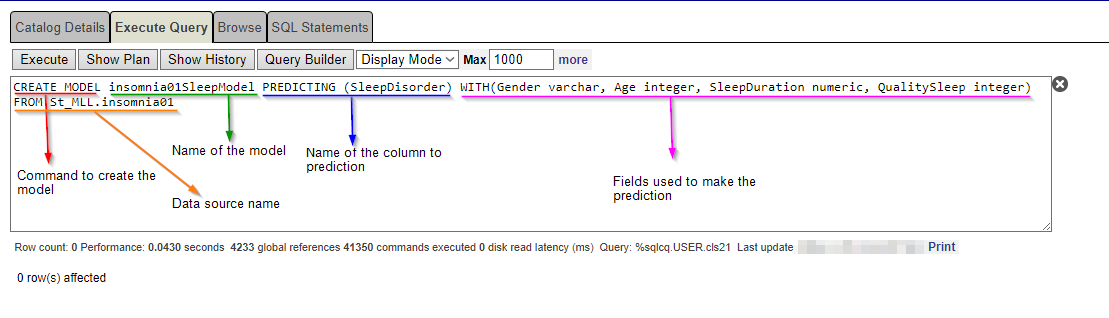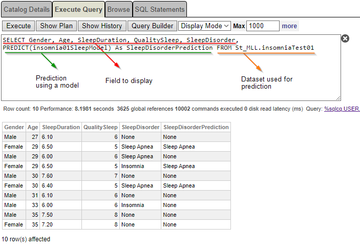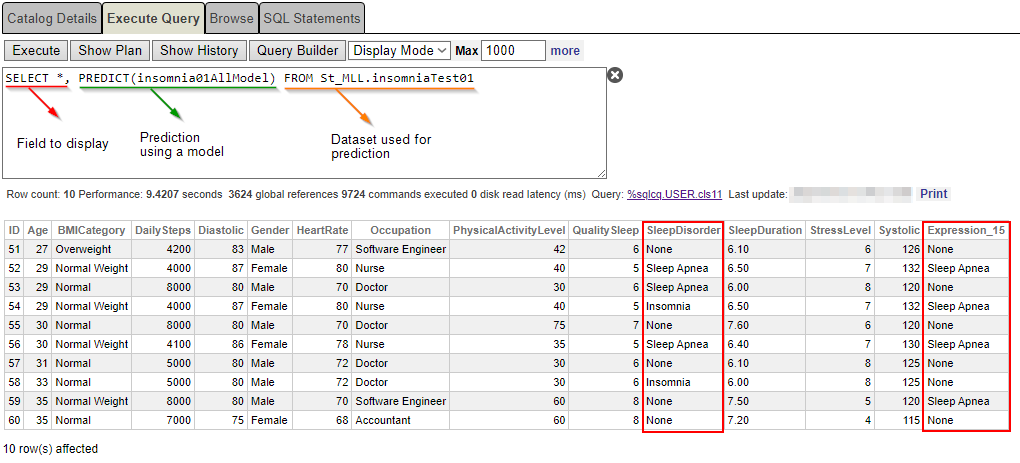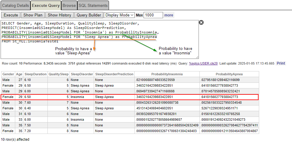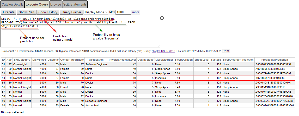 SELECT *, PREDICT(insomnia01AllModel) As SleepDisorderPrediction, PROBABILITY(insomnia01AllModel FOR'Insomnia') as ProbabilityPrediction FROM St_MLL.insomniaTest01Es la probabilidad de padecer “insomnio” como trastorno del sueño.