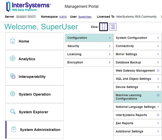 En segundo lugar, necesitará una instancia de IRIS Community. Puede descargar una imagen de Docker y ejecutar su prueba aquí. Tenga en cuenta que debe tener ML integrado, por ejemplo, la última versión de InterSystems IRIS Community.