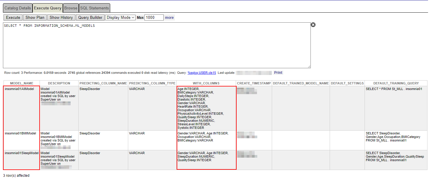 CREATEMODEL insomnia01SleepModel PREDICTING (SleepDisorder) WITH(Gender varchar, Age integer, SleepDuration numeric, QualitySleep integer) FROM St_MLL.insomnia01CREATEMODEL insomnia01BMIModel PREDICTING (SleepDisorder) WITH(Gender varchar, Age integer, Occupation varchar, BMICategory varchar) FROM St_MLL.insomnia01