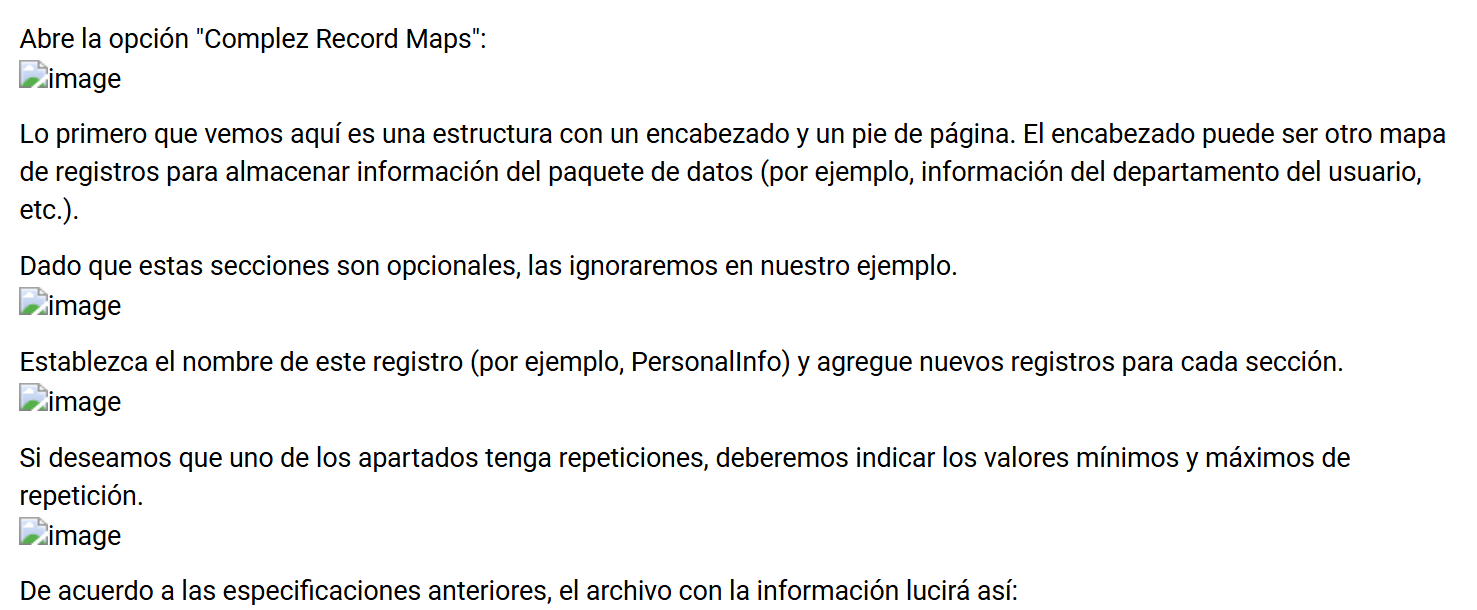 Los Complex Record Map son precisamente lo que su nombre indica. Se trata de una combinación de varios Record Maps que nos proporciona información más completa y estructurada.