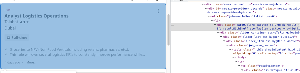 En este escenario nos interesa la lista de trabajos que normalmente se encuentra en una etiqueta < div >. En el navegador se puede inspeccionar el elemento para encontrar la clase "div".