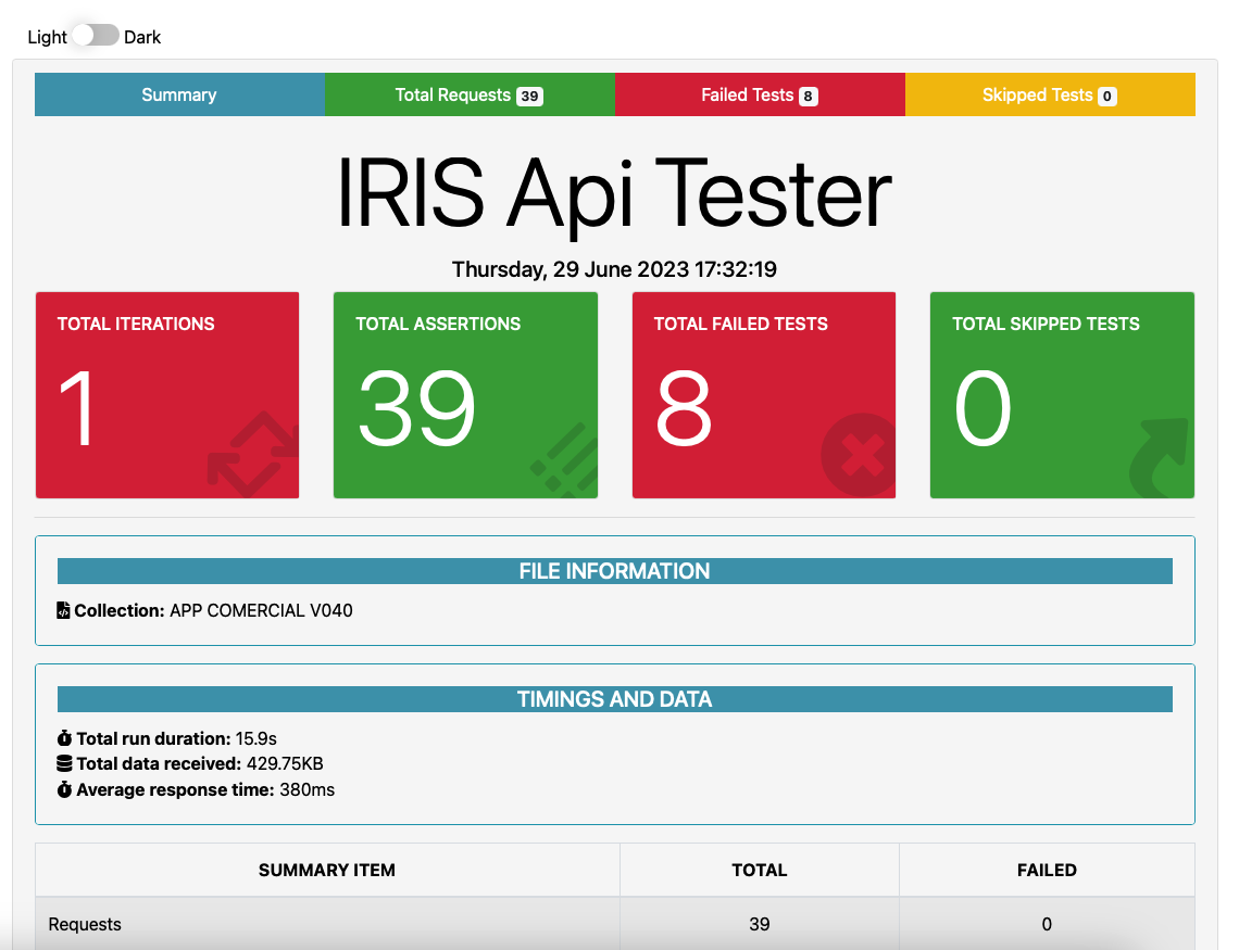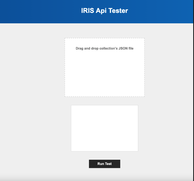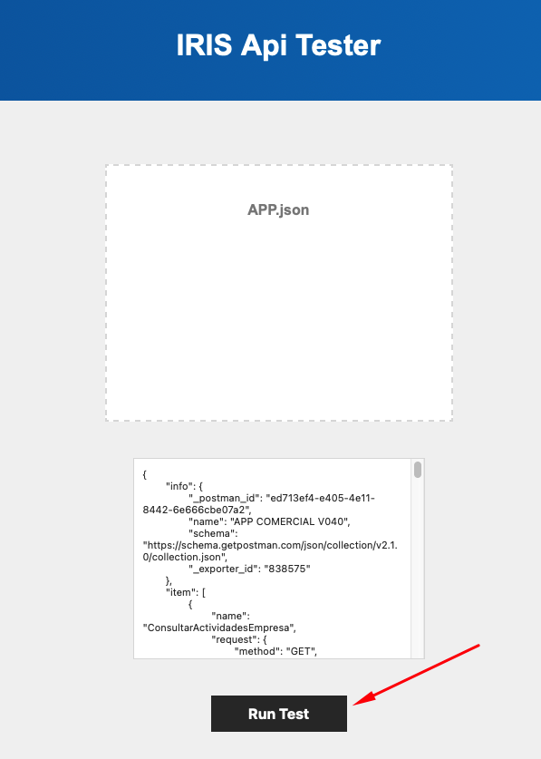 Arrastra el fichero json a la página de IRIS APi Tester y presiona el botón "Run test":