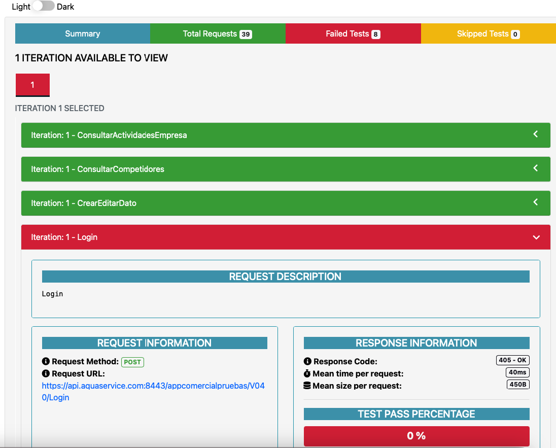 Para esta prueba estoy comprobando que el código de respuesta recibido sea igual a 200, en caso que el código de respuesta sea distinto a 200 el item aparecerá como error en el informe.