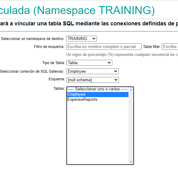 En el asistente, indicamos la configuración, seleccionando de la lista desplegable, la conexión SQL Gateway que creamos (Employee) y luego el esquema vacío, pues en este caso de ejemplo no hay esquemas configurados, el asistente desplegará las tablas disponibles y podemos seleccionar la de nuestro interés (en este ejemplo: Employee) y vamos a "Siguiente":
