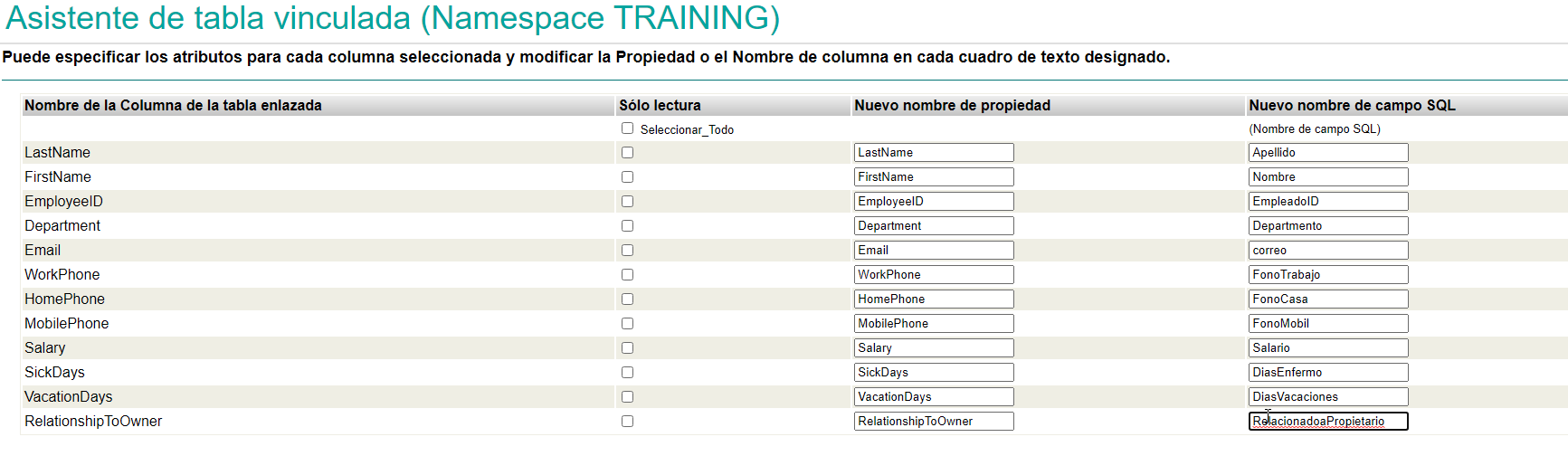 En este paso del asistente, podemos seleccionar su alguno de los campos será de acceso de sólo lectura (por defecto serán lectura y escritura) y además con qué nombre identificaremos cada uno desde SQL, por defecto el asistente replicará el nombre de cada campo para el nombre de SQL, pero podríamos modificarlos como en este ejemplo:
