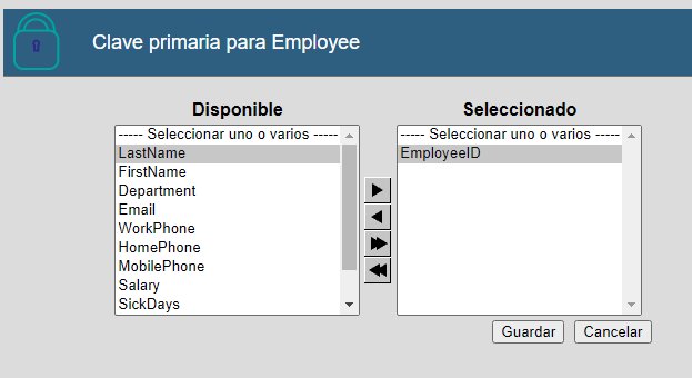 Ahora, necesitamos indicar a IRIS qué campo es el de acceso clave o primario, como no lo reconoce de forma automática, en este caso es necesario hacerlo de forma manual, hacemos clic en el botón de "Buscar" para seleccionar "EmployeeID" :